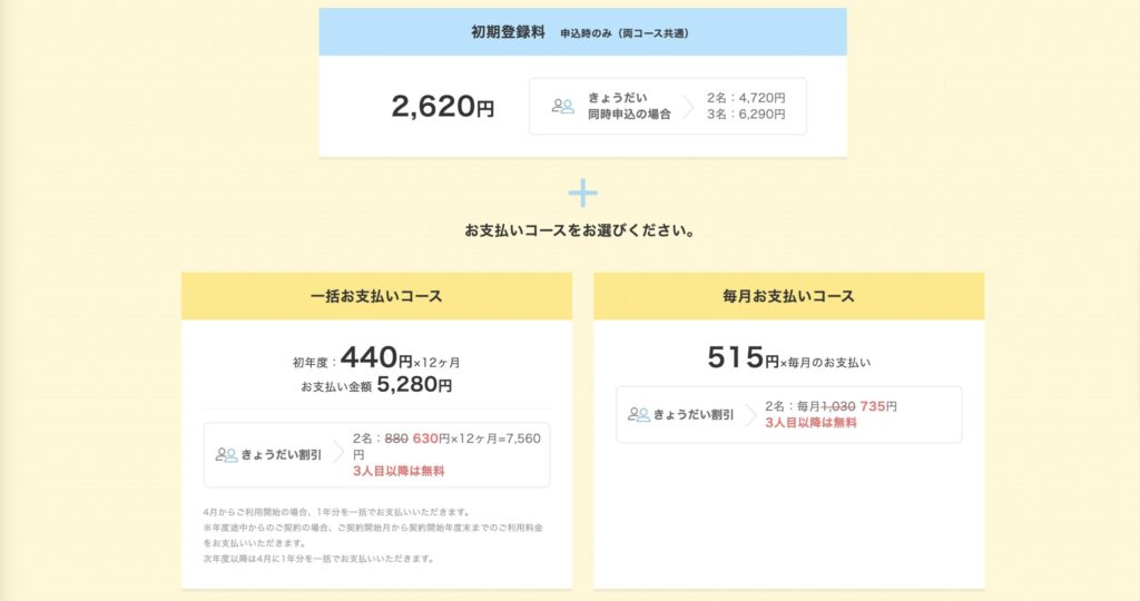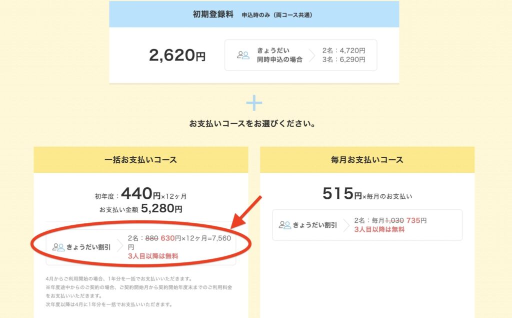 - お子さん2人なら、初期登録料と月額が割引される♪