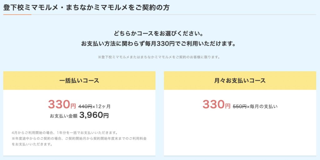 具体的な料金は、現在利用しているミマモルメのサービスによって異なります。登下校ミマモルメなどの有料サービス契約者であれば月額330円(税込)