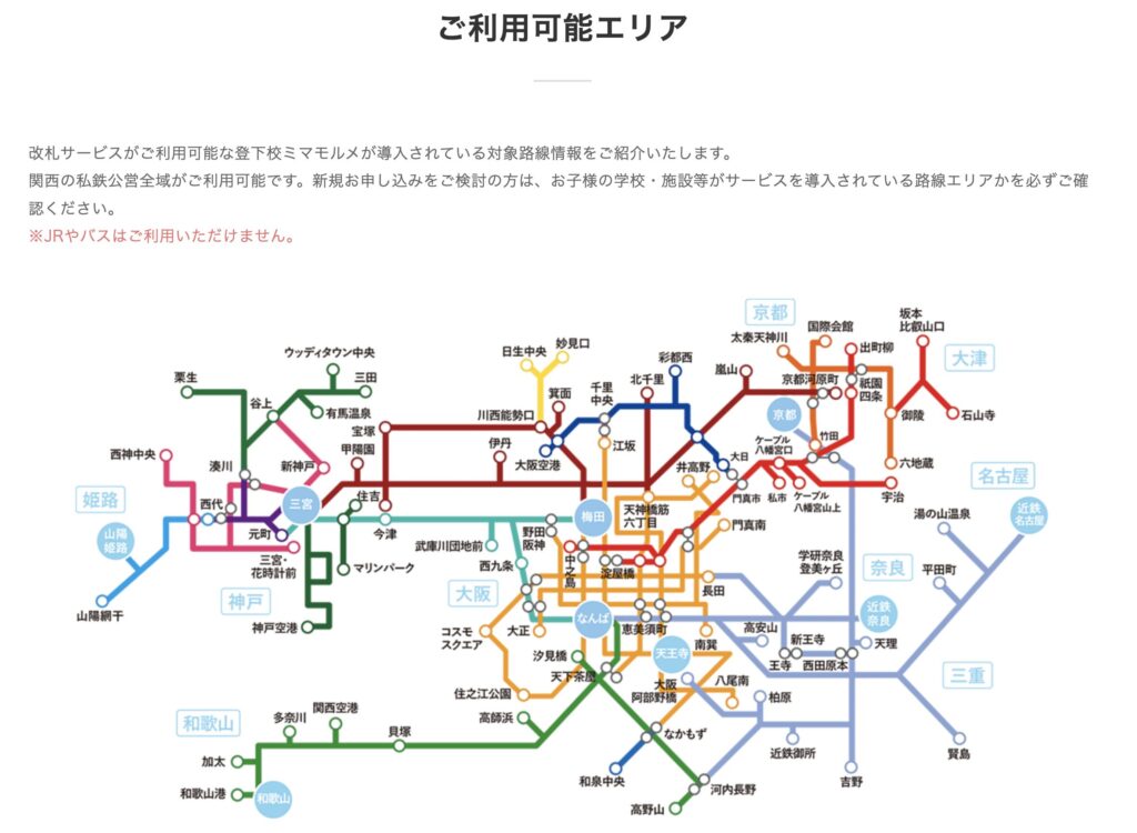 改札ミマモルメのサービスが利用可能なエリアは、関西の私鉄公営全域(一部対応していない改札を除く)。これは、通学で日常的に利用する駅だけでなく、お出かけなどで普段使わない駅の改札でも通過情報が通知されます。