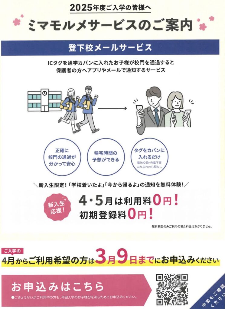 - 通常、月額460円(年間一括払いで月額380円、税込)の登下校メールサービスの利用料が0円。